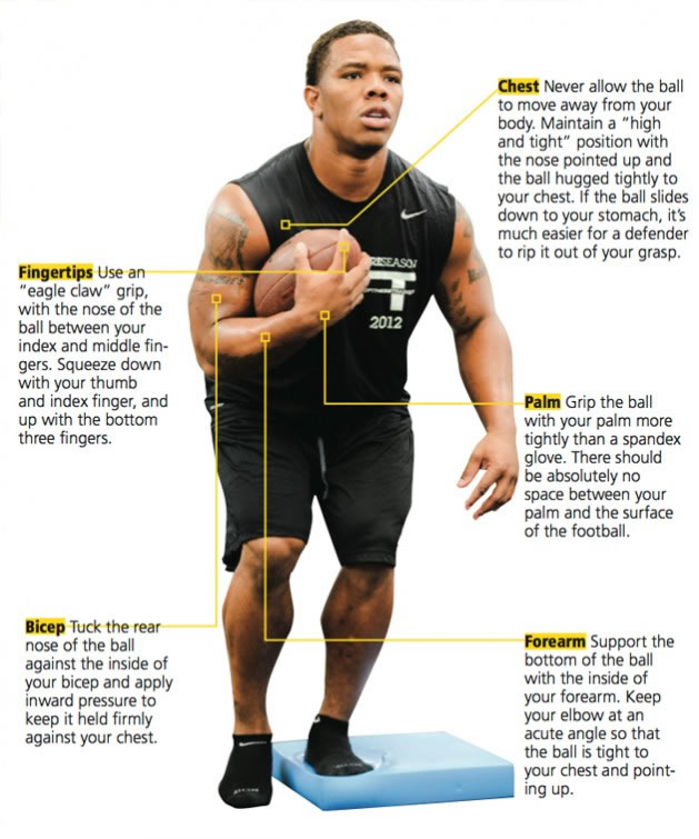 Review the five points of pressure between the ball and the body (one point of the ball in the armpit, palm/fingers firm around the other point of the ball). Demand he put two hands on the ball when running through traffic, especially near the goal line.