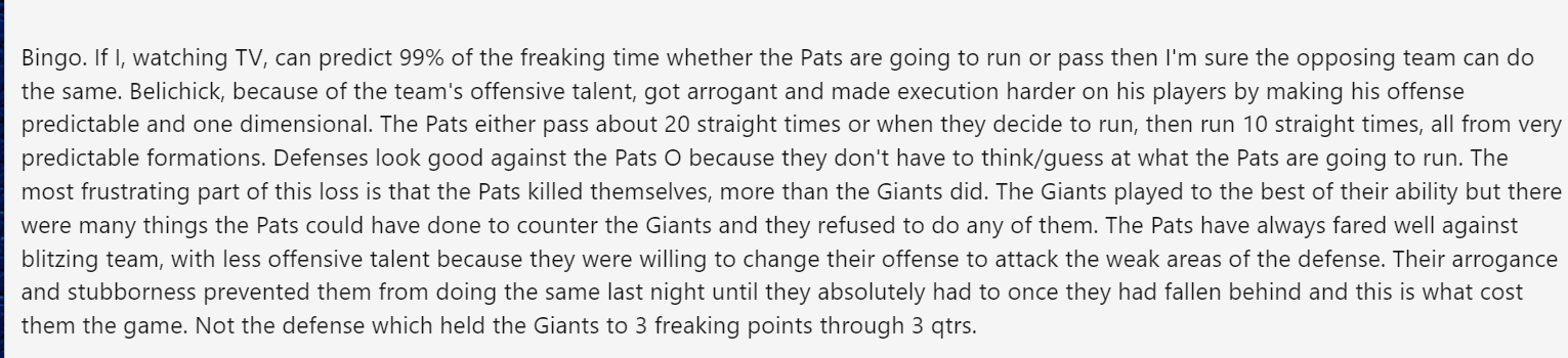 It's always been "what have you done for me lately" to the extreme. The Patriots, during their heyday, could have won ten straight games and as soon as they lost one, the sky was falling. Every time Brady had a bad game since 2008, the "cliff was coming" people would come out of the woodwork.