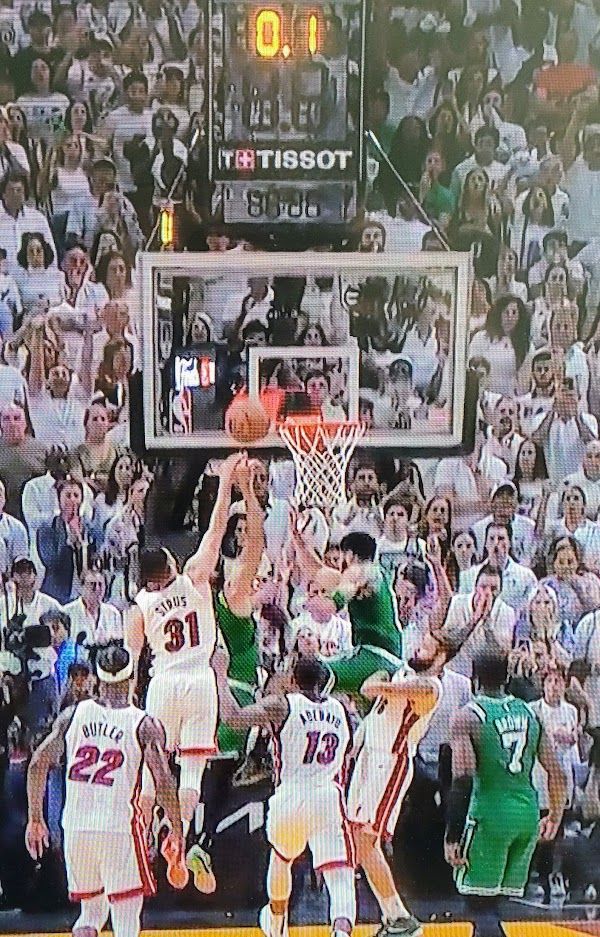 But there it was on replay. The ball left White’s fingertips with 0.1 seconds on the clock. The backboard was not lit up yet. Were Celtics’ fans dreaming? Let me see another replay. And another. Every time they showed a replay, it showed the same thing. The shot was good. The Celtics won. The Heat were not going to the Finals just yet. There would be a Game 7.