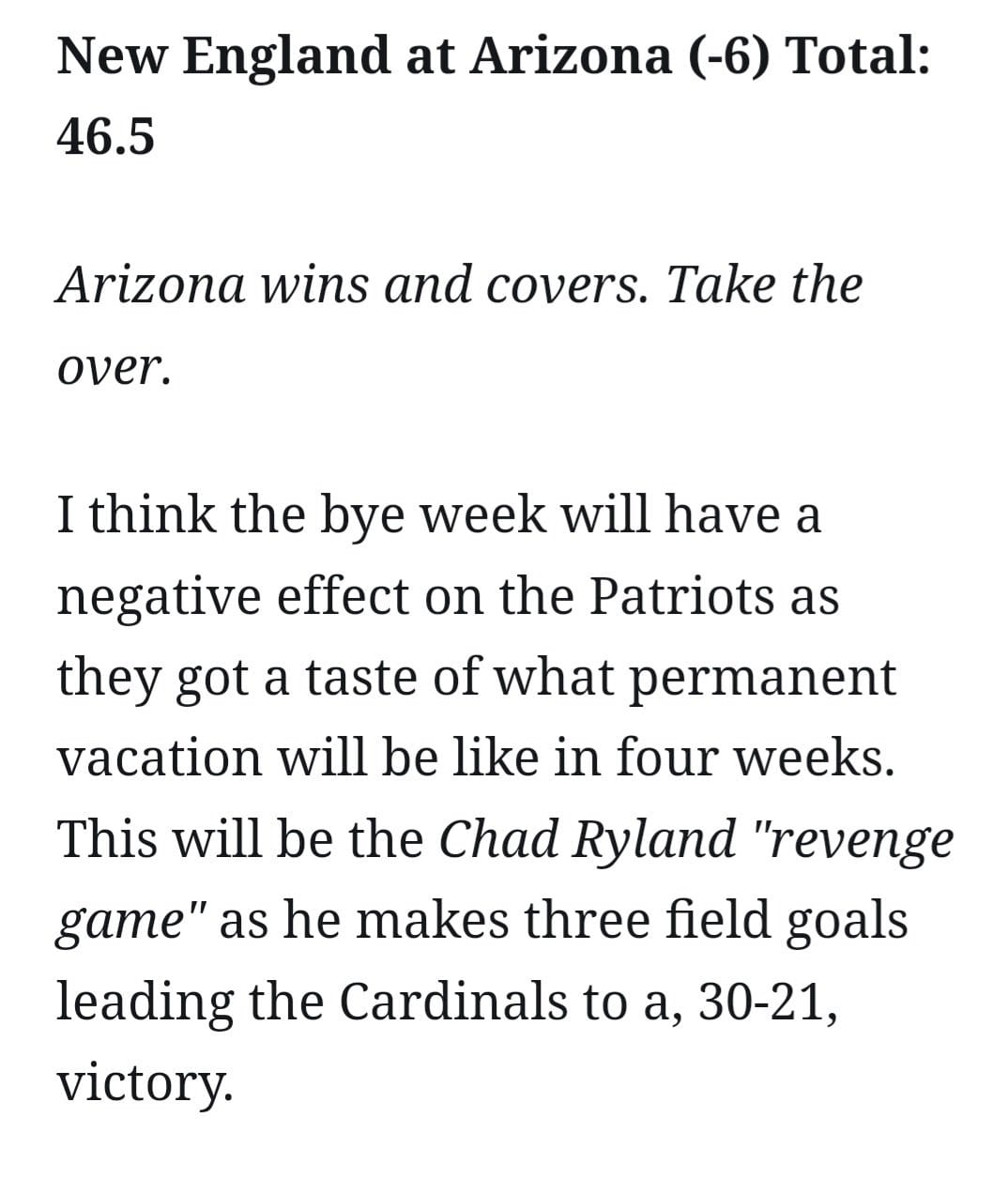 I'm pretty proud of my Patriots' pick last week. I almost nailed the score. I guessed 30-21 and it finished up 30-17. I also said that Chad Ryland would have three field goals in his "revenge game" and he had, exactly, three. I also predicted New England would come out flat after their bye week, and they sure did.